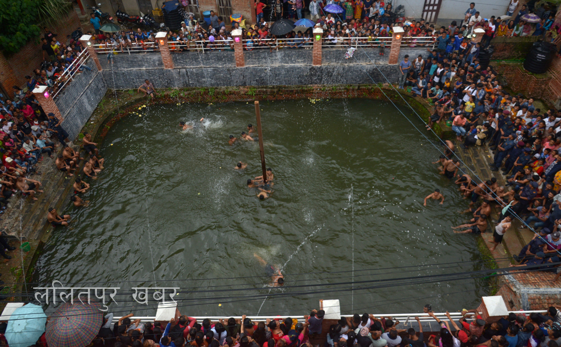 ५.जात्रामा पोखरीको बिचमा रहेको खामो चढेर पोखरीमा रामाइलो प्रतिश्यर्धा चलेको थिायो । नाङ्गो शरिरले सानो खामो चढ्न कठीन भए पनि हेर्न रामाइलो थियो ।