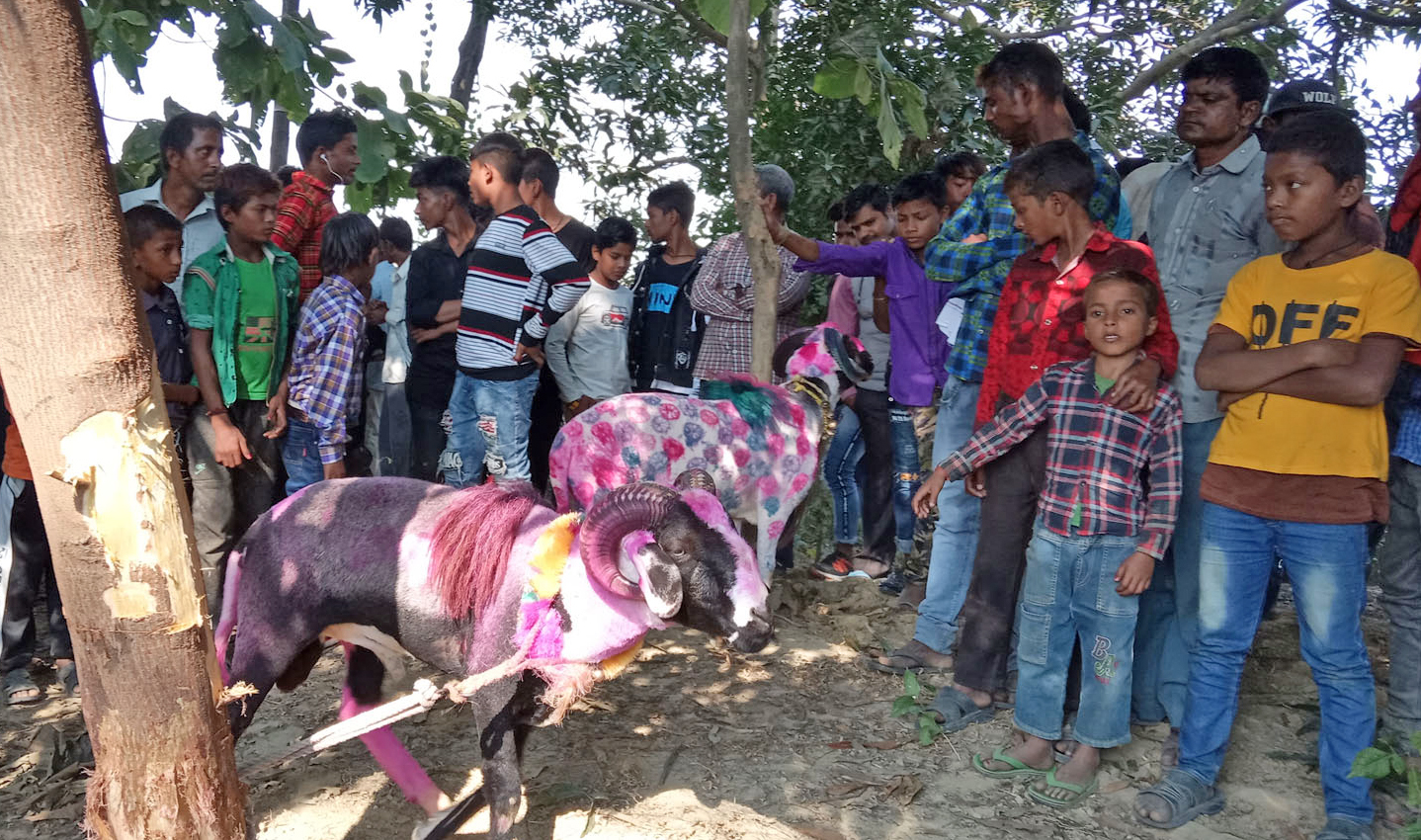 बाँकेको जानकी गाउँपालिका ५ बेलहरीमा प्रत्येक वर्ष लाग्ने गुरुवागाउँ मेलामा जुधाउन ल्याईएका भेंडा । तस्वीर ः भेषराज बस्नेत