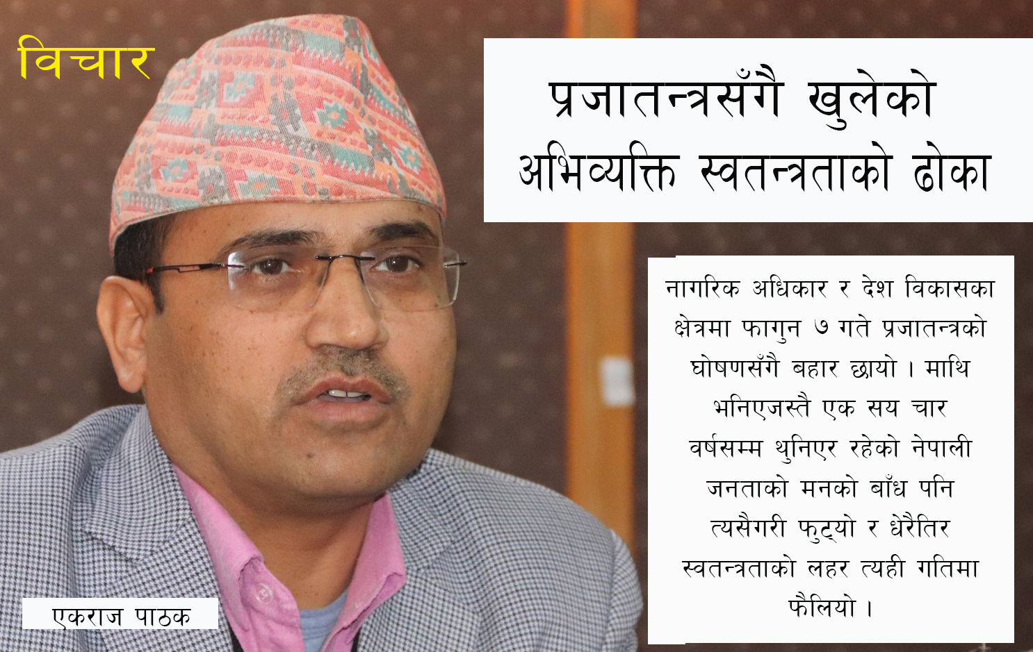 कल्पना गरौँ, एक सय चार वर्षसम्म थुनेर राखिएको कुनै खोलाको बाँध फुट्दा एकैपटक कुन बेगमा भल बग्ला ? त्यो खोलाको बहावको गति कति होला ? राणा शासनले एक सय चार वर्षसम्म नागरिकका इच्छा, आकाङ्क्षा एवं उनीहरूको बोल्ने अधिकारमा ताला लगाइदियो । यसरी देखेर पनि बोल्न नपाएका जनताले सामाजिक, राजनीतिक तथा अरु कैयौँ क्षेत्रमा मुख खोले । नागरिक अधिकार र देश विकासका क्षेत्रमा फागुन ७ गते प्रजातन्त्रको घोषणसँगै बहार छायो । माथि भनिएजस्तै एक सय चार वर्षसम्म थुनिएर रहेको नेपाली जनताको मनको बाँध पनि त्यसैगरी फुट्यो र धेरैतिर स्वतन्त्रताको लहर त्यही गतिमा फैलियो । एक सय चार वर्षसम्म थुुनिएको खोलाको बाँध अकस्मात फुट्दा जुन बेगले भल बग्यो नेपाली नागरिकका मनमस्तिष्कमा पनि त्यस्तै दु्रतगतिमा स्वतन्त्रताको बहाव आयो । उनीहरूले पनि यस्तै बेगमा आफूलाई स्वतन्त्र भएको महसुस गरे र आफ्ना विचार तथा अभिव्यक्ति स्वतन्त्रताको अभ्यास गर्ने भए । अर्थात् एक शब्दमा भन्दा अब नेपाली जनता बोल्न पाउने भए । उनीहरूमाथि राणा शासनले लगाएको बोल्न नमिल्ने बार भत्कियो । मानिसले देखेको कुरा बोल्न पाउनु पनि त्यस समयको ठूलो अधिकारको विषय थियो । अब नागरिक बोल्न पाउने भए ।