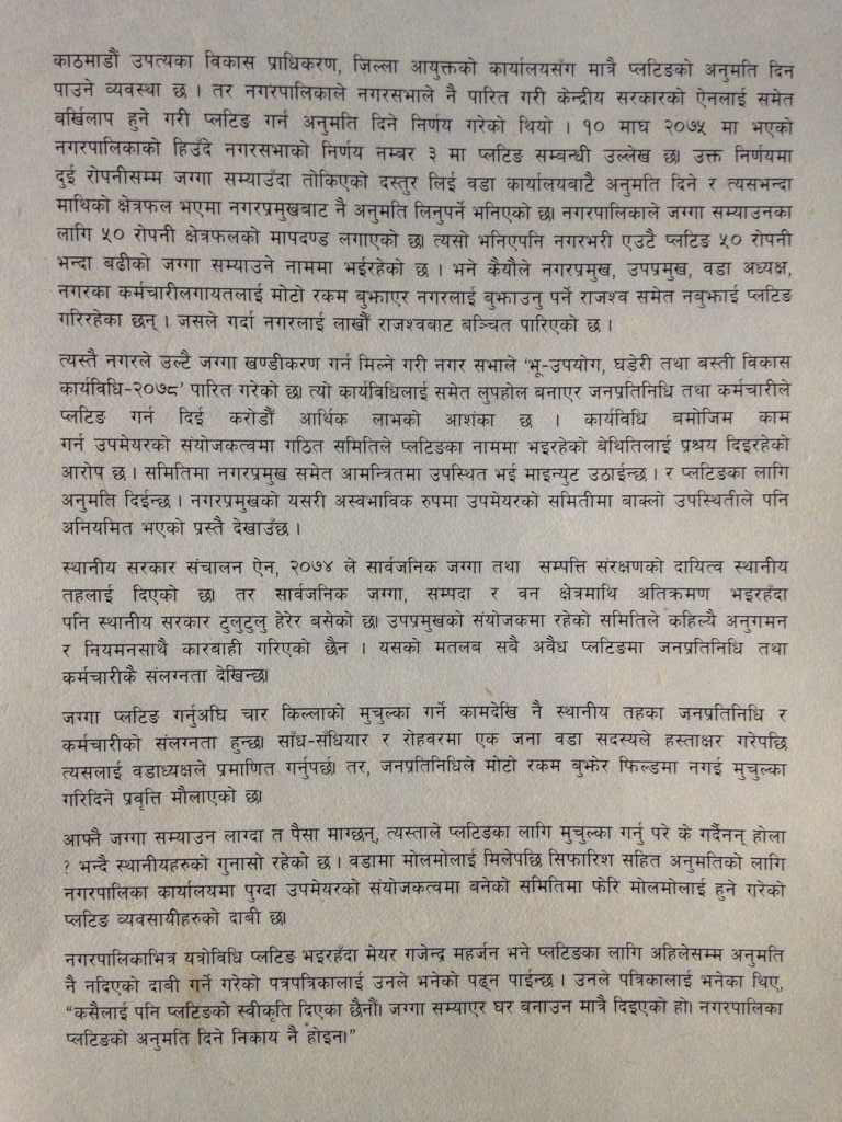 उजुरीमा मेयर महर्जन र उपमेयर अधिकारीले नगरपालिकाको वडा नं. १ देखि १४ सम्म अबैध जग्गा प्लटिङ गर्न अनुमती दिएको अनुमती दिएको ठाँउमा राजकुलो वन र सार्वजनिक जग्गा मिचिएको छ राजकुलो सार्वजनिक जग्ग र वन क्षेत्र मिचेको जानकारी रहे पनि अनुगमन गरेर कारवाही नगरेको आरोप लगाइएको छ ।