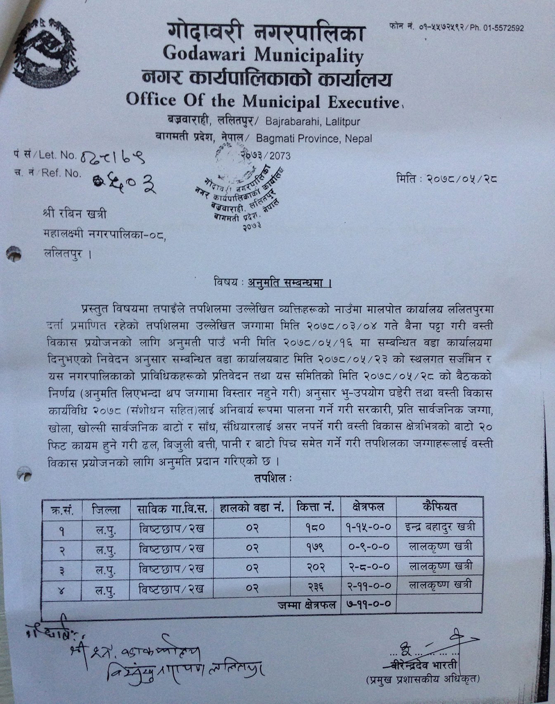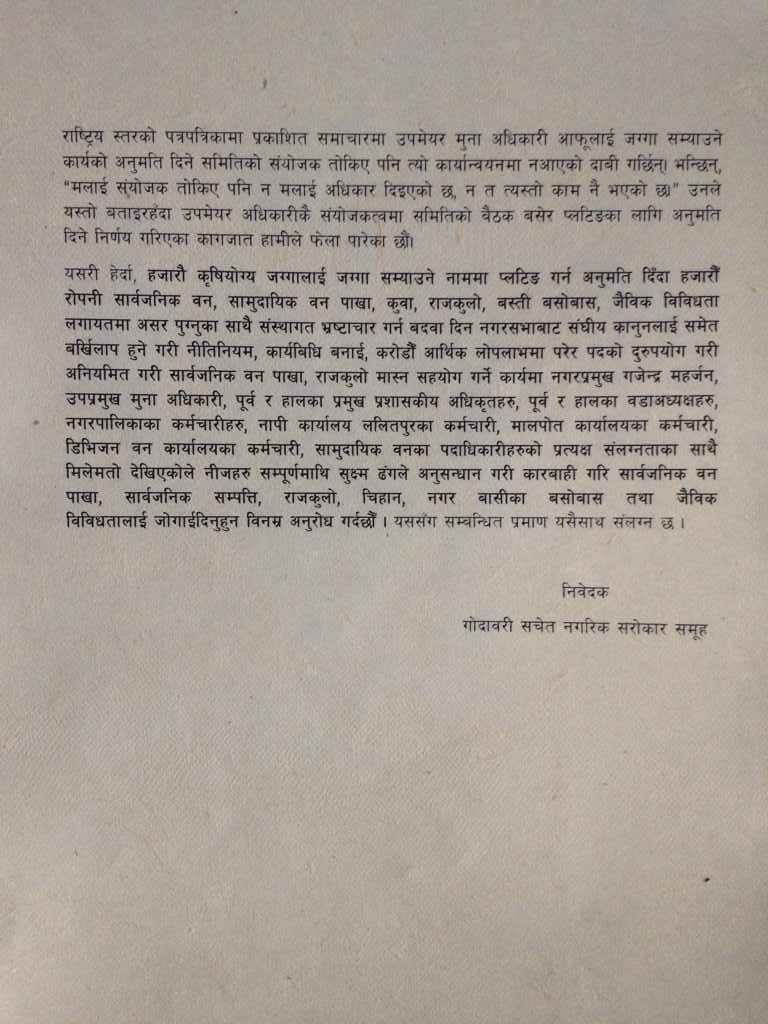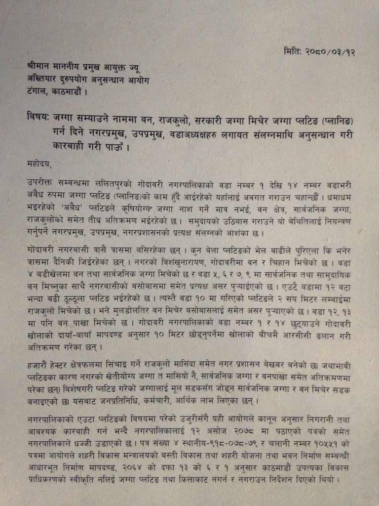 नगरपालिकाको एक प्लटिङको उजुरीसँगै १२ असोज २०७८ मा आयोगले पठाएको पत्रको समेत नगरपालिकाले धज्जी उडाएको उत्येख गरिएको छ । आयोगले गोदावरी नगरपालिकालाई शहरी विकाश मन्त्रालयको बस्ती तथा शहरी विकास योजना तथा भवन निर्माण सम्बन्धि आधारभूत निर्माण मापदण्ड २०६४ को दफा १३ को ६ र १ अनुसार काठमाडौं उपत्यका विकास प्राधिकरणको स्वीकृती नलिई जग्गा प्लटिङ तथा कित्ताकाट नगर्न निर्देशन दिएको थियो ।